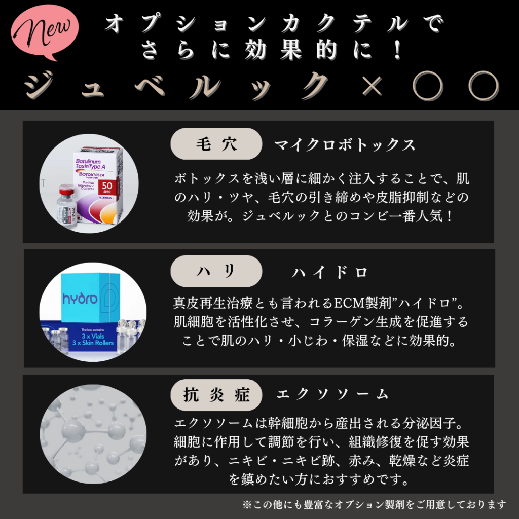 オプションメニューで製剤の追加が可能となり、ジュベルックの効果にプラスし、さらにお悩みに特化した製剤を組み合わせることが可能になりました!